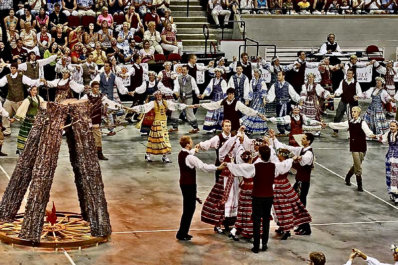 The two-and-a-half-hour divertissement that was the Juventas Festival started with a parade and a song. There was some speech-making. There was a violin, a couple of wind instruments, and a drummer, while an accordion led the way. There were costumes galore and faux torches. There was circle dancing. There was pairs dancing. The pairs dancing got fast and lively. There was more singing. Before every part of the show a young man and a young woman in civilian clothes explained, in both English and Lithuanian, what was coming up. A group of kids did their own version of a circle dance. Not one of them got dizzy and fell over. There was a courtship dance, the young men and women taking their wooden shoes off and going at the romance barefoot. Whenever the top guns came back, everybody sat up. They were good as gold. They had it going.